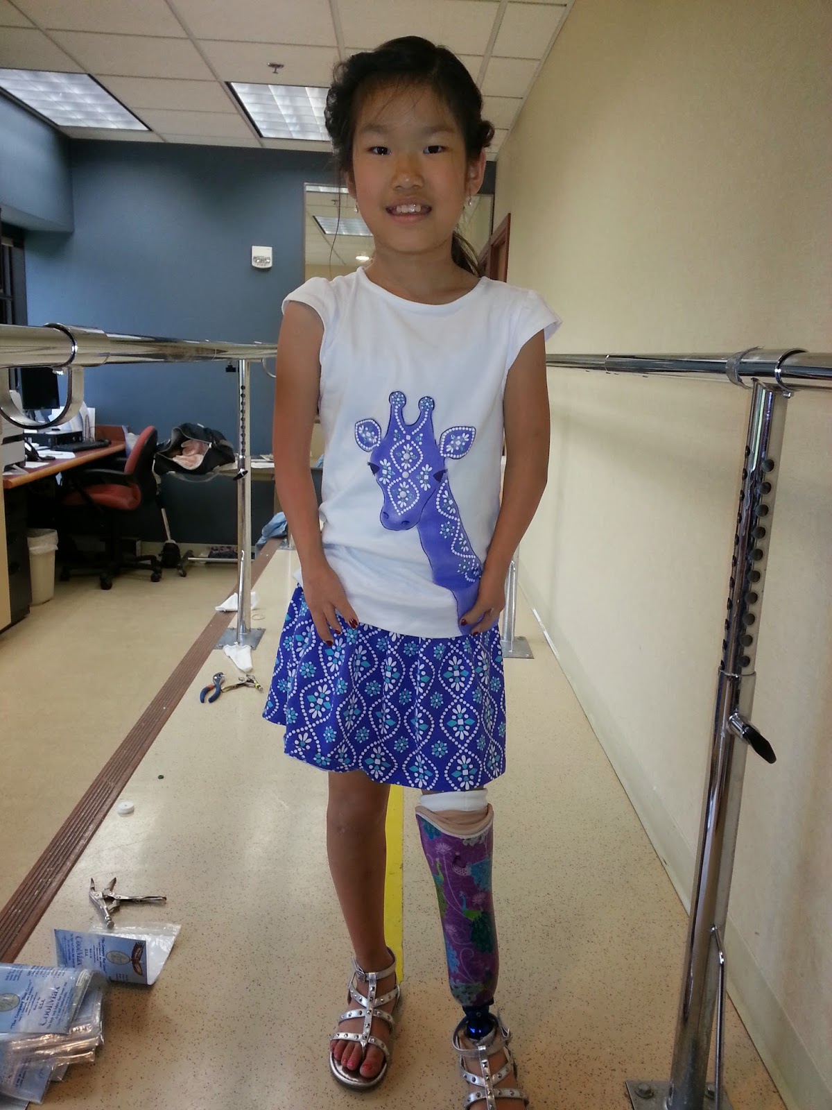 Elizabeth had received her leg last week BUT there were still a few issues with it -- the foot was turned out AND they laminated it with the fabric going the wrong direction. So, the peacocks were all sideways!